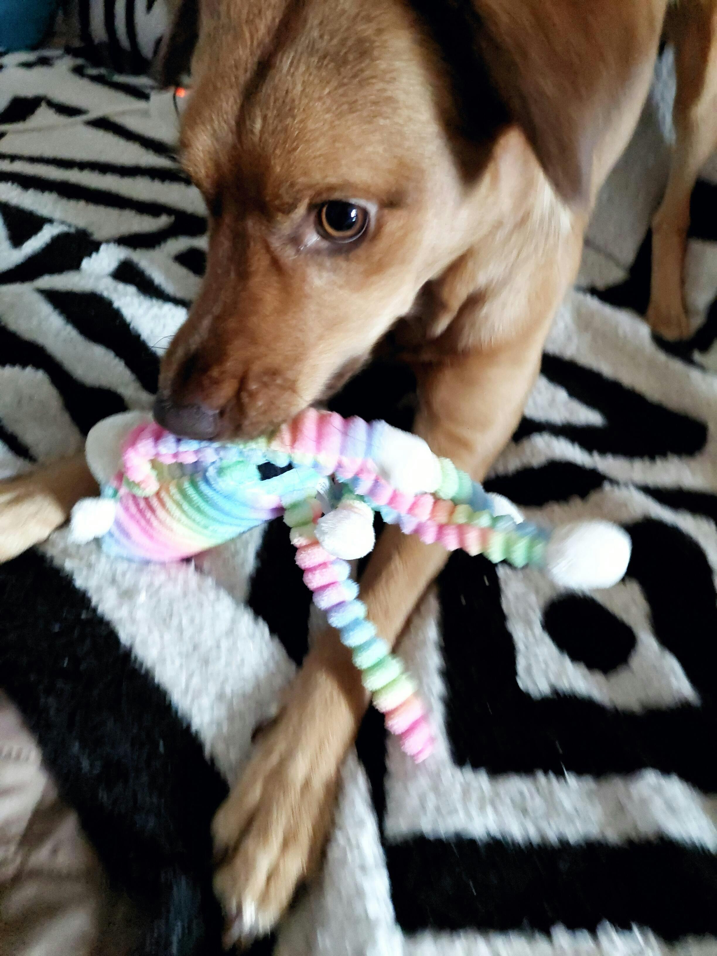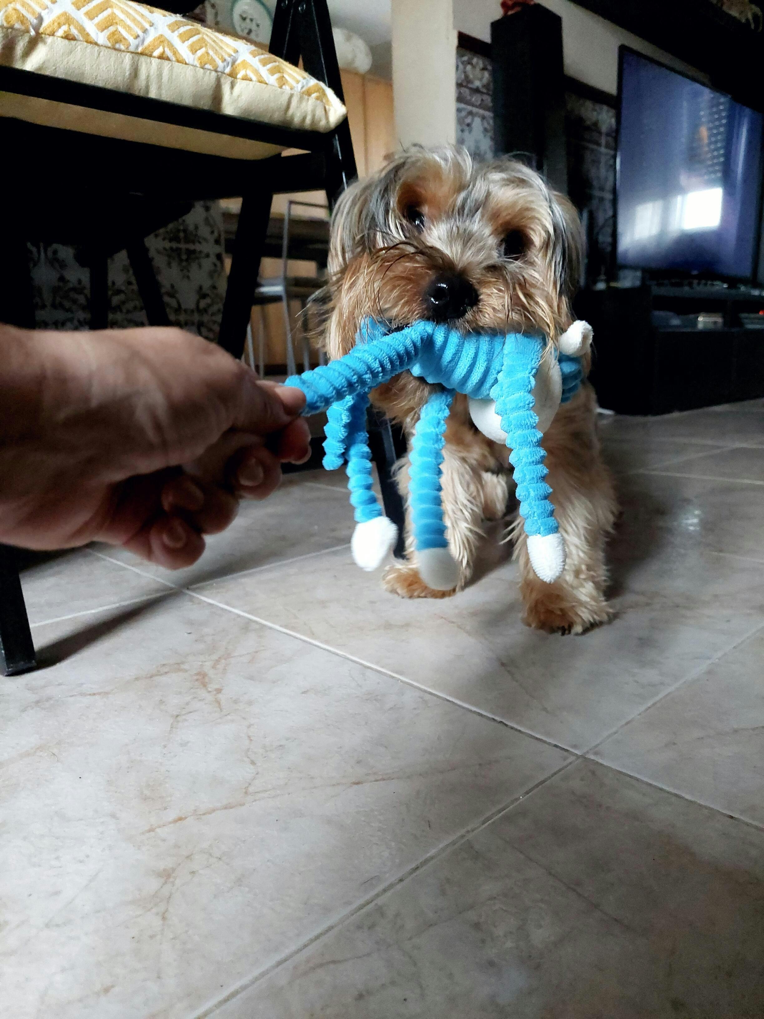 Estes macacos de peluche têm pouco enchimento e são recheados com material "crinkle" nos braços, pernas e cauda, fazendo um som que os cães adoram.