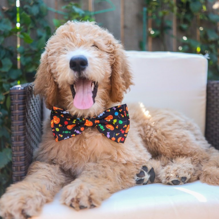 Os laços de coleira Trick or Treat tão disponíveis em três tamanhos. Indicado para cães e/ou gatos.