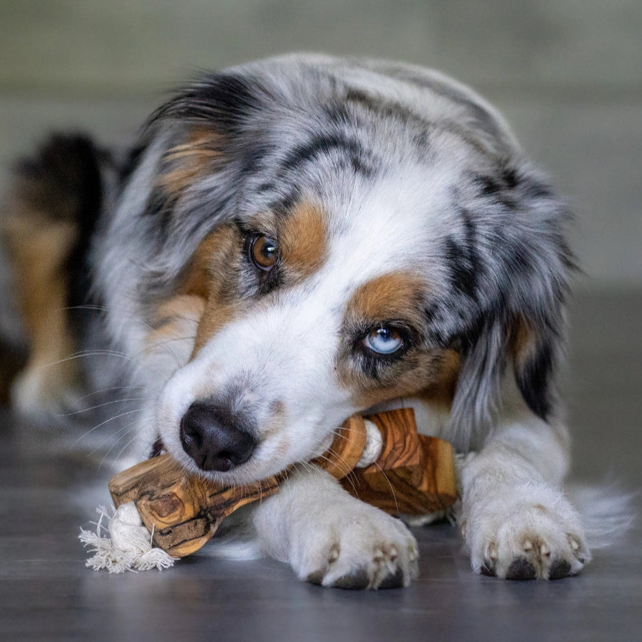 Feito na Europa a partir de madeira de oliveira e 100% natural 🪵🌿, com corda em algodão e formato de osso repartido em vários pedaços, está pronto a ser roído, de forma segura. A madeira é polida e infusionada com óleo de oliveira, sendo uma excelente alternativa a pauzinhos ou aos rodapés aí de casa.